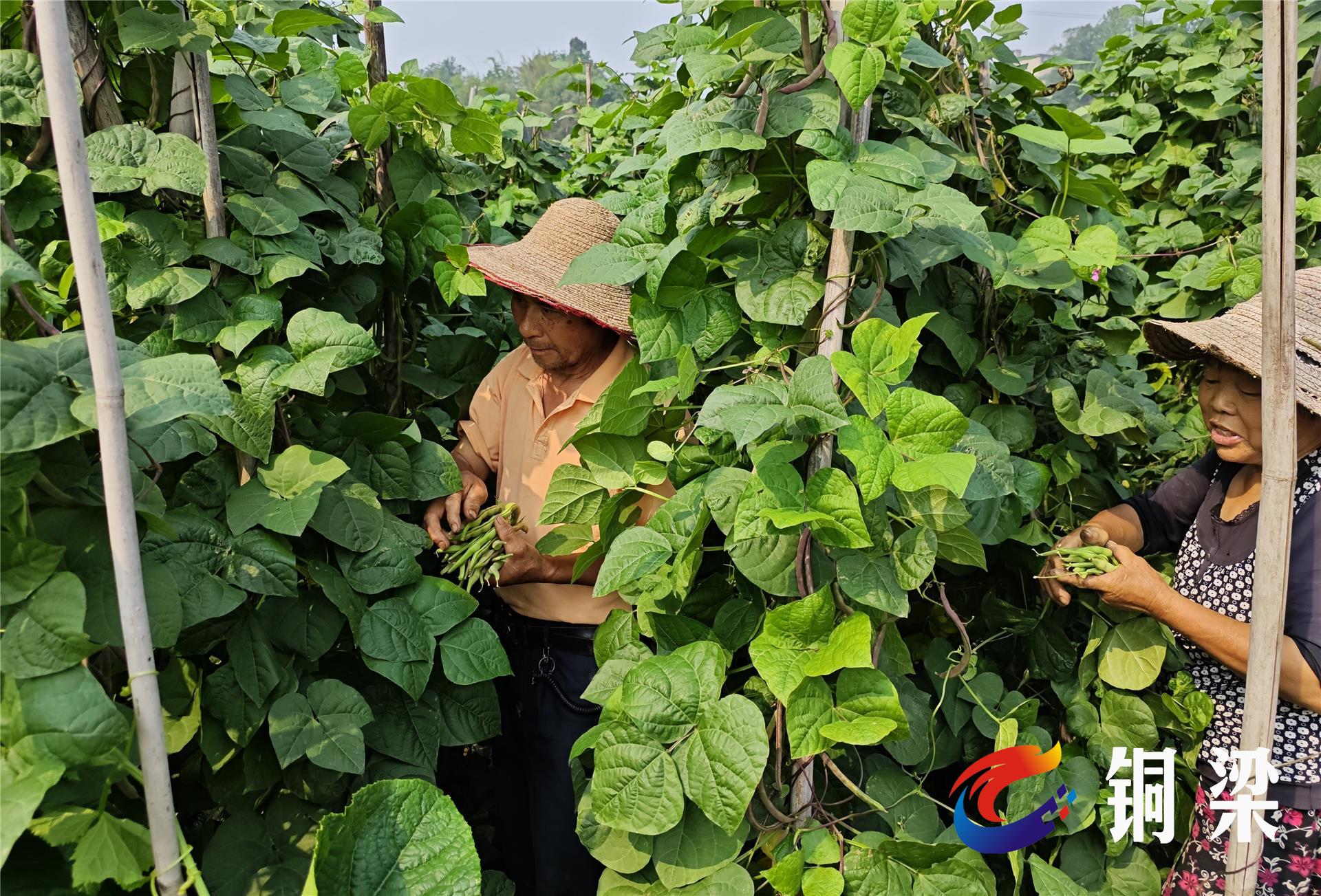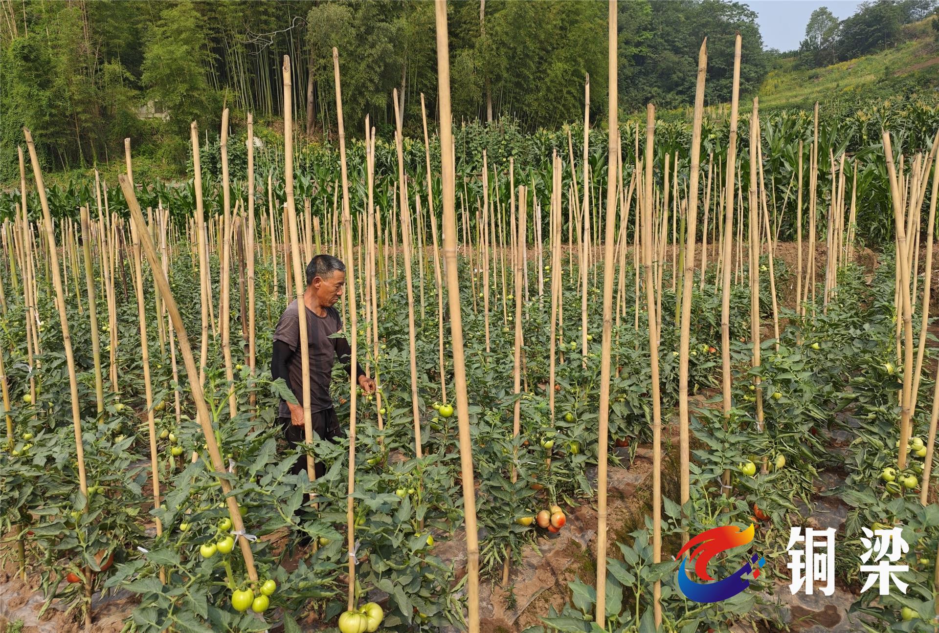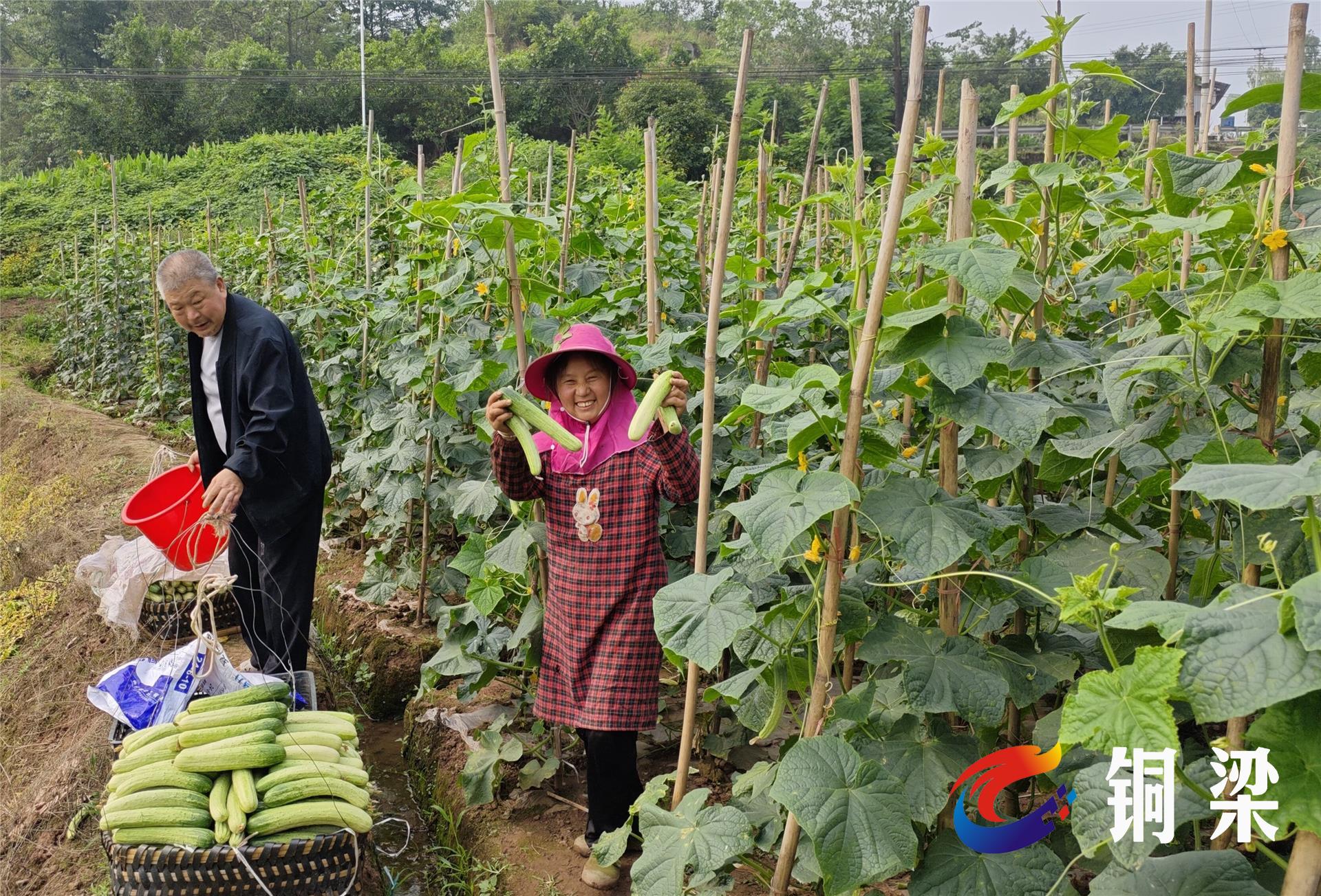 5月18日,在铜梁区大庙镇三品村的菜地里,村民们正忙着采摘黄瓜、四季豆、西红柿、青椒、茄子等蔬菜。