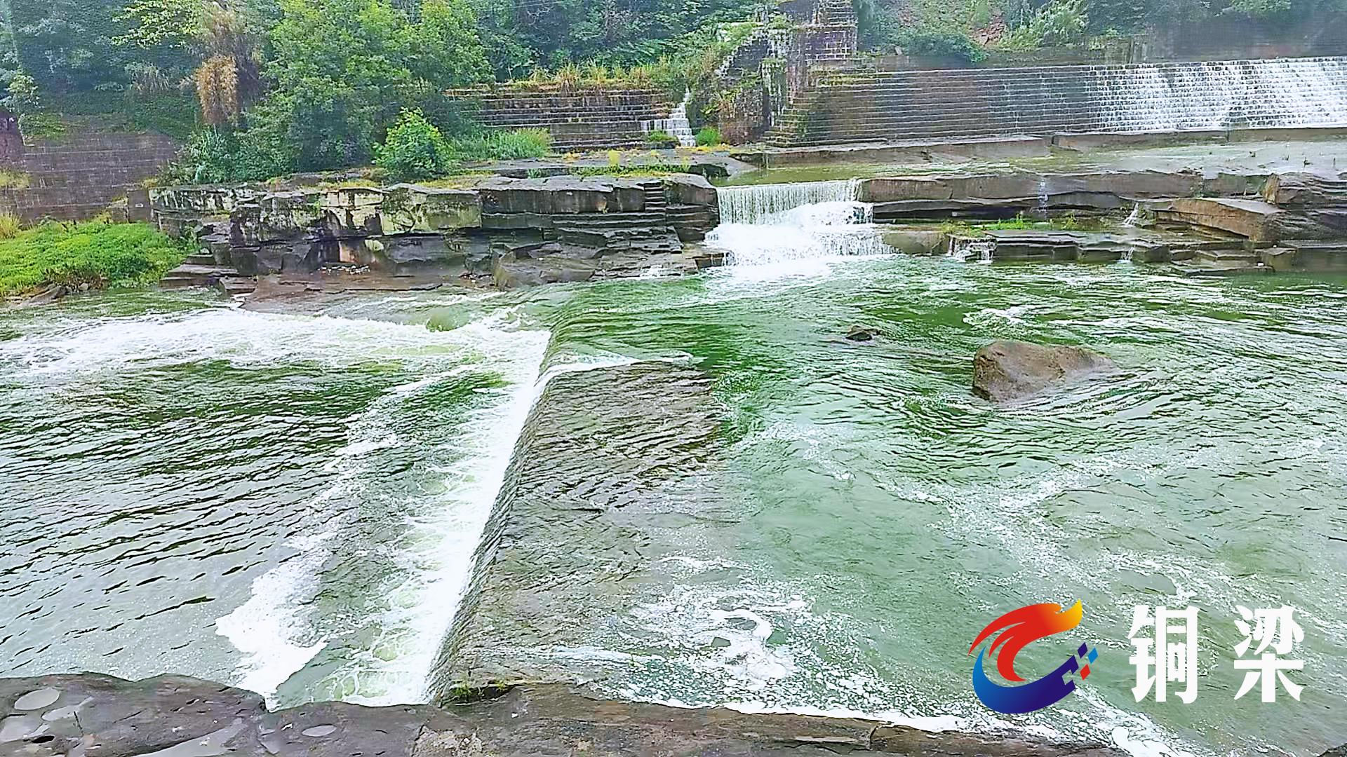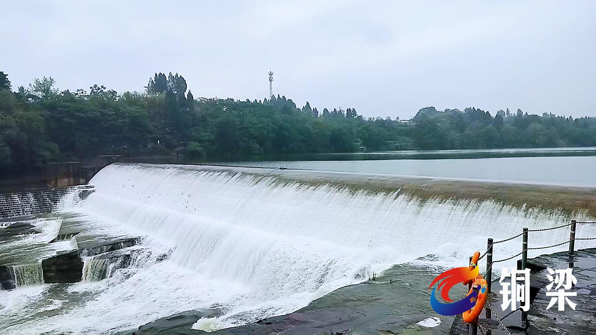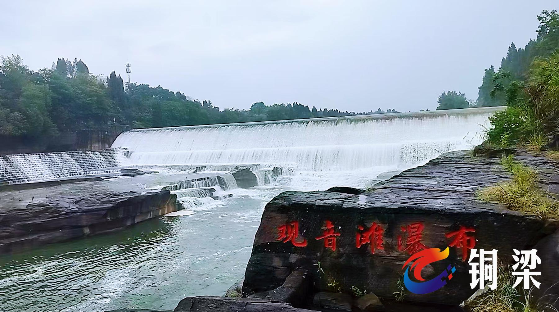 6月19日上午,在铜梁区维新镇槐树村观音滩,巨大的水流从堤坝倾泻而下,像一道白色的银幕挂在半空。