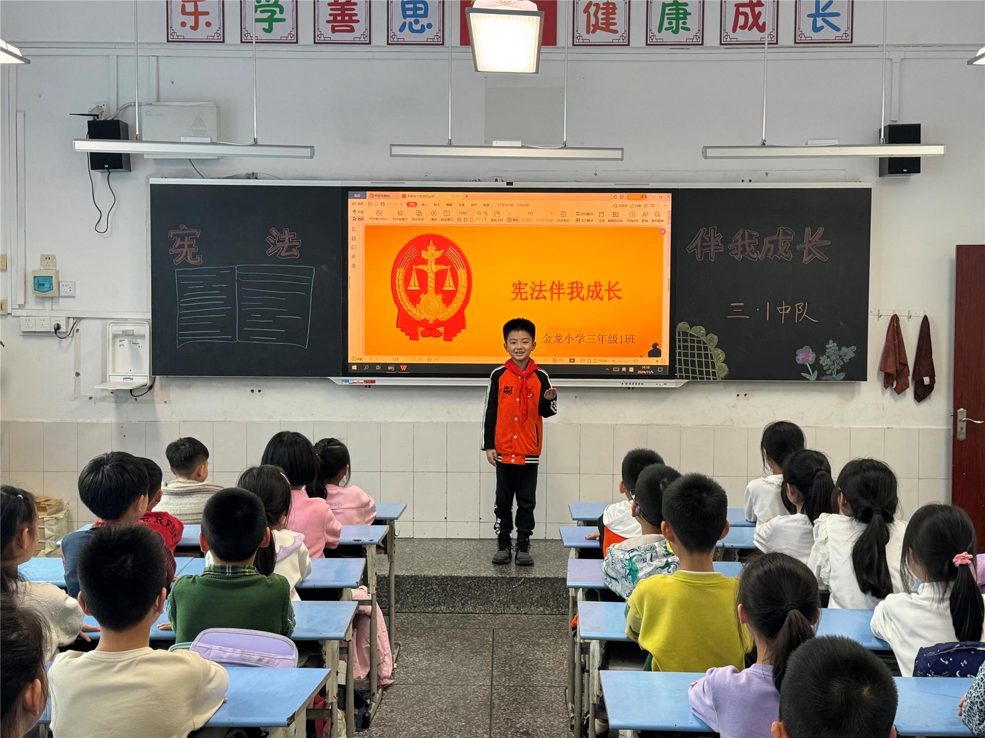 在铜梁区金龙小学,铜梁区司法局东城司法所所长、金龙小学法治副校长杨立以“宪法伴我成长”为主题,为孩子们开展了一堂普法讲座。