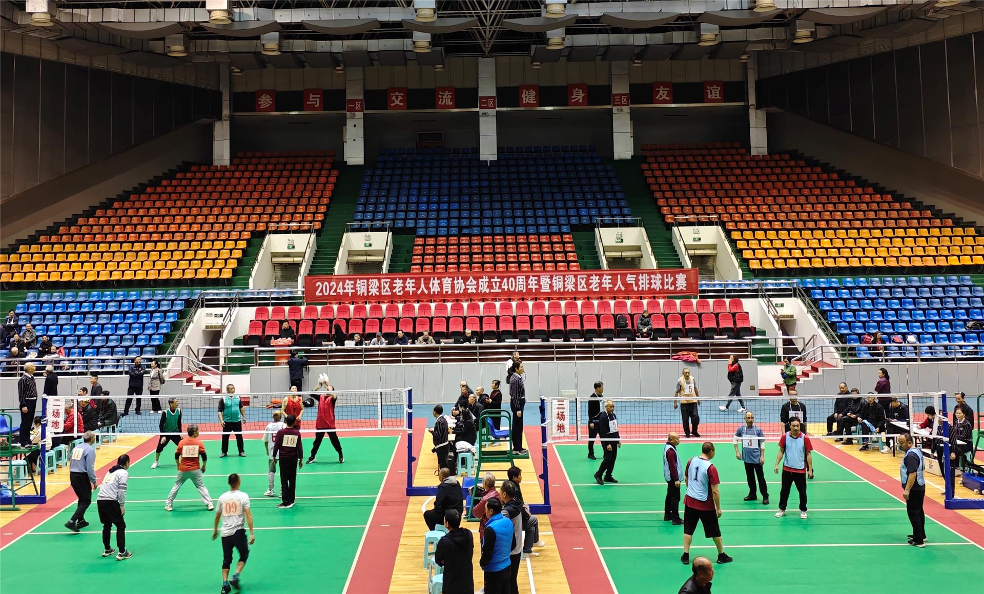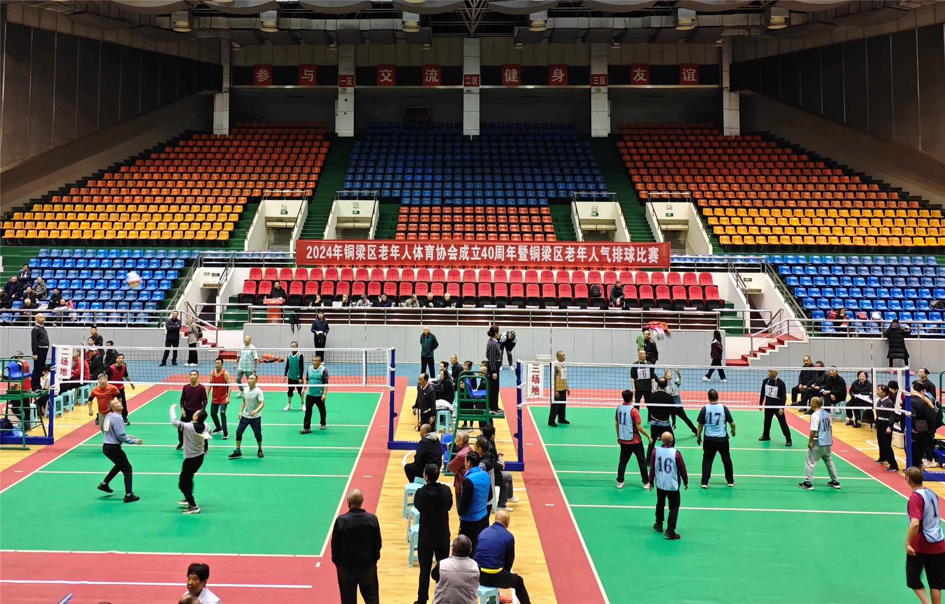 11月17日,铜梁区老年人体育协会成立40周年暨老年人气排球比赛在金龙体育馆开幕。