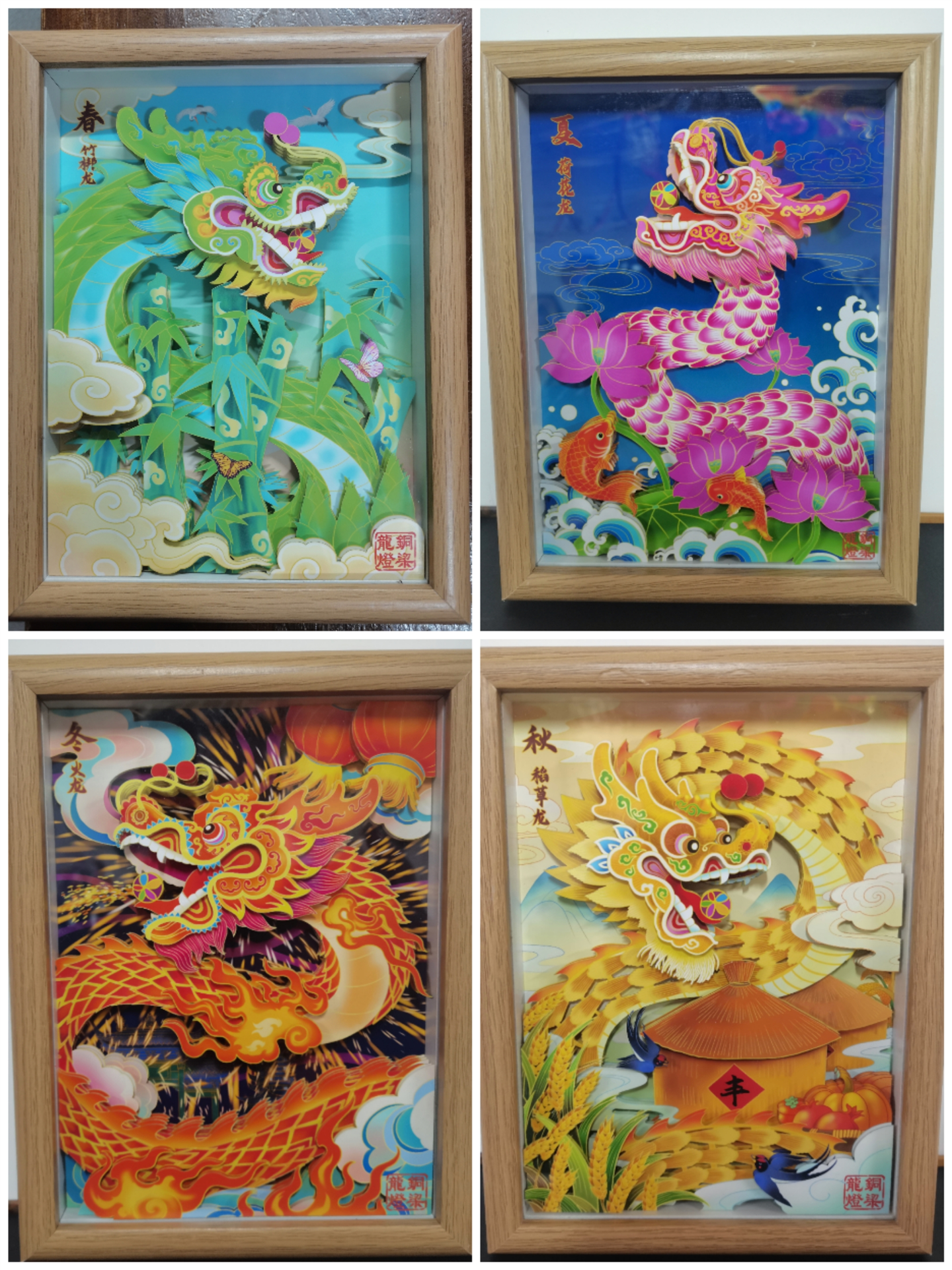 与春夏秋冬四季分别对应的《竹绑龙》《荷花龙》《稻草龙》《火龙》立体剪纸作品