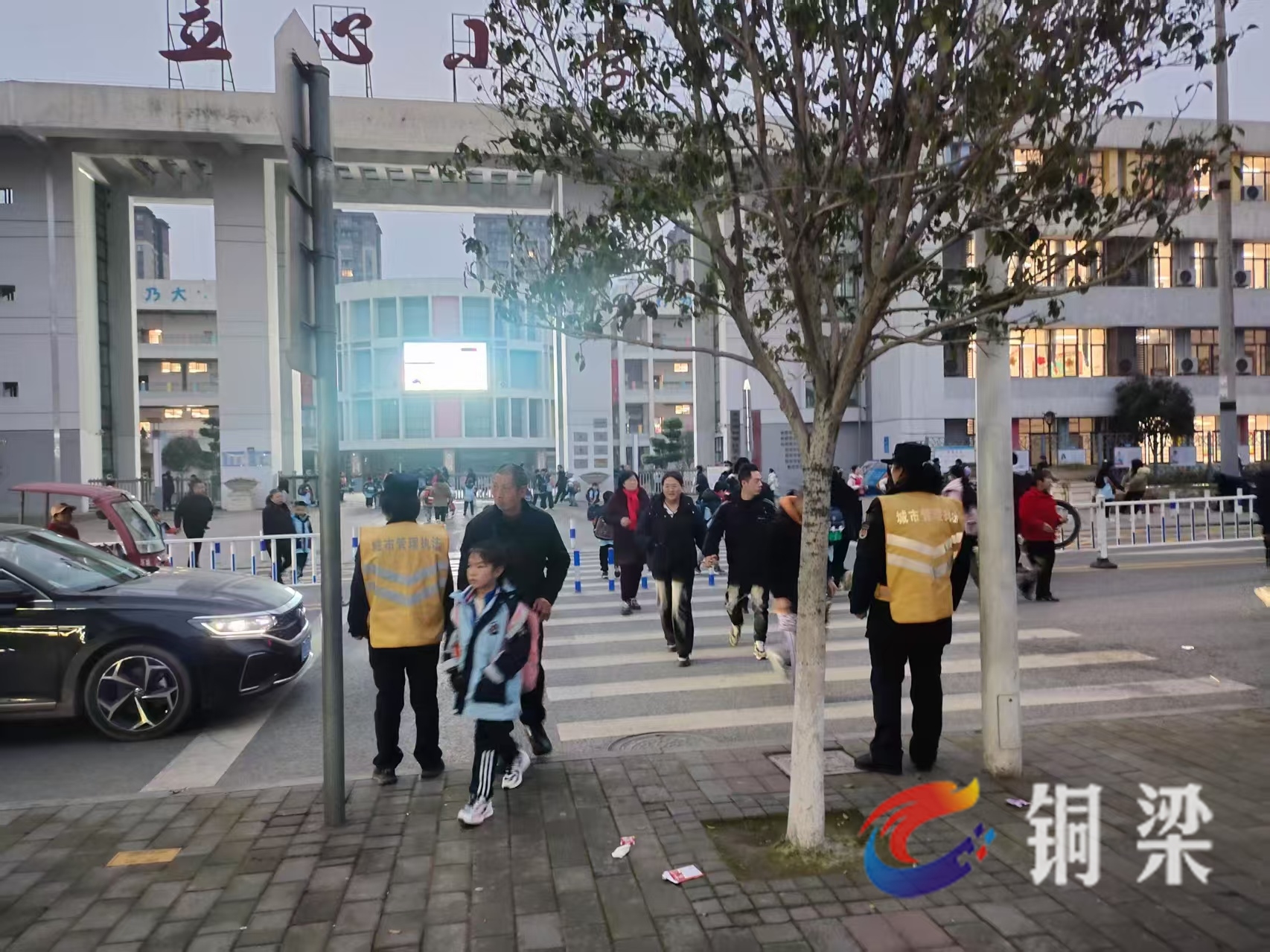 “小朋友,慢点走,注意安全!”2月20日早上,在铜梁区巴川小学校门口,城管队员李世贵正在路口维持秩序,引导家长有序停车,确保校园周边交通畅通,守护学生安全。