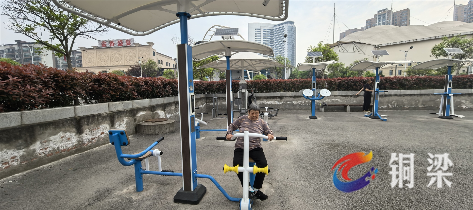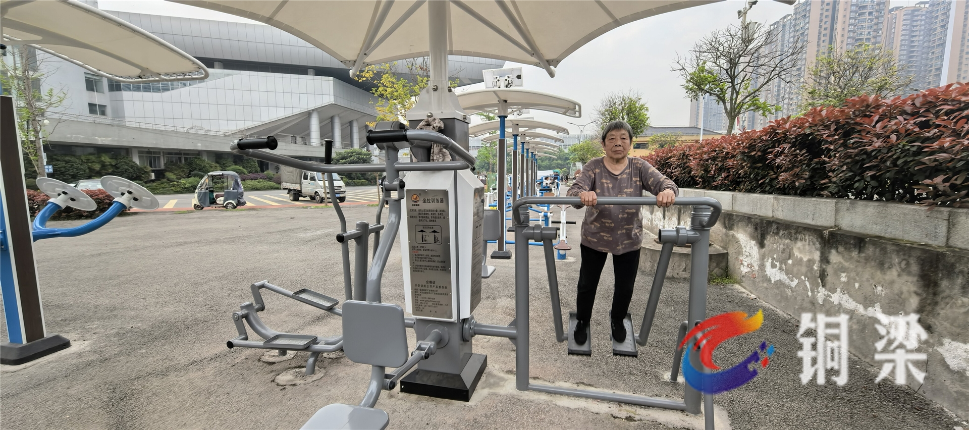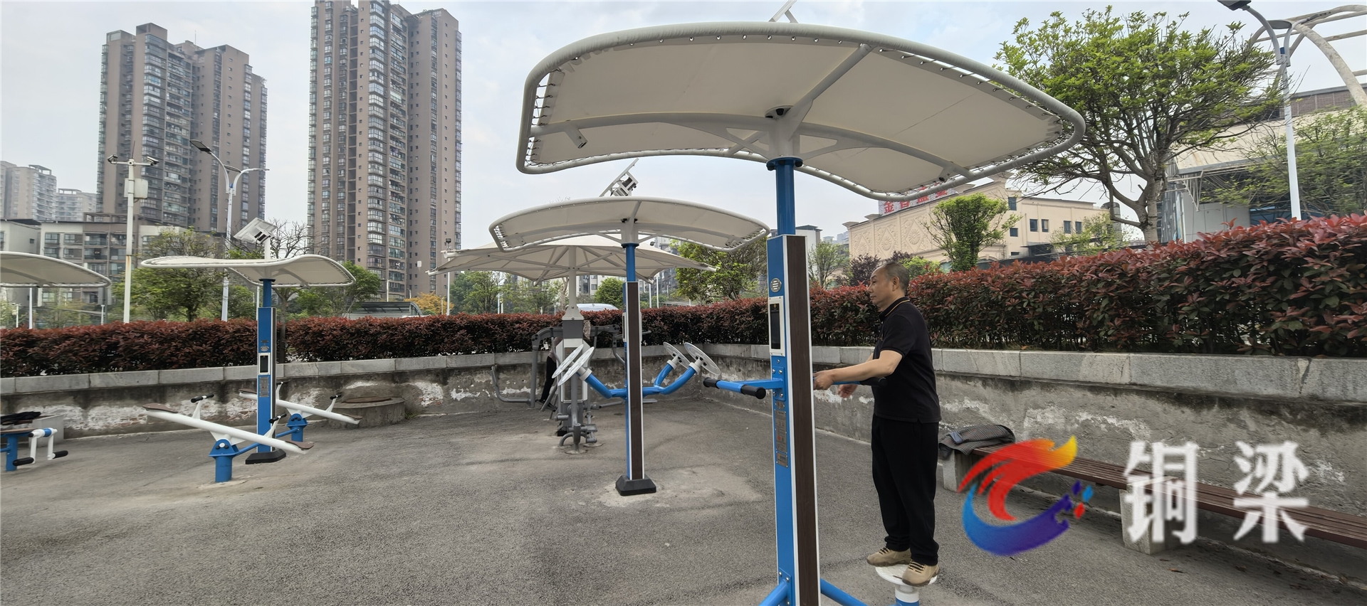 4月9日早上,在铜梁城区金龙体育馆外的露天公共活动区,几位市民正在智能化健身器材上锻炼身体。与传统健身器材不同的是,每个智能器材都安有遮挡太阳和雨水的顶棚,器材上则有显示屏,记录显示健身者时间、消耗的卡路里、运动强度等运动数据。
