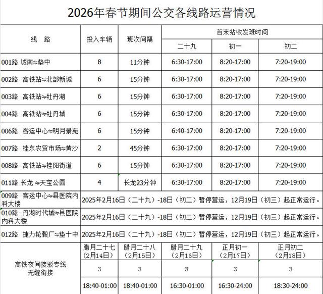 2月13日,记者从县交通运输委获悉,2月16日(腊月二十九)至2月18日(正月初二)期间,我县部分公交线路运营临时调整,3条线路临时停运,高铁夜间接驳专线延时至凌晨。(2026年春节期间公交各线路运营情况。)据了解