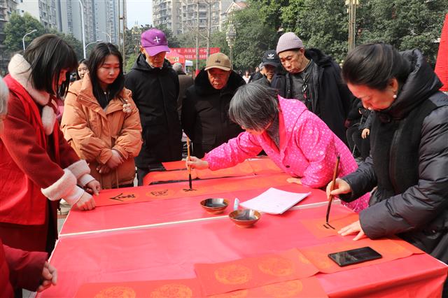 2月4日,桂阳街道新时代文明实践所举办“迎新春送春联”现场书法惠民活动,邀请辖区书法爱好者与志愿者挥毫泼墨,为居民送上饱含马年祝福的手写春联。 (书法爱好者正在手写春联。记者 周迎迎 摄)活动现场,大红宣