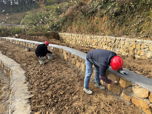 金桂果园露营基地现场施工负责人程杰介绍,目前,项目已完成荒野剧场看台砌筑、集装箱商店场地平整和林间小路施工等。