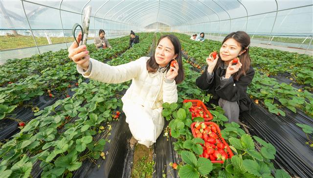 市民采摘草莓。