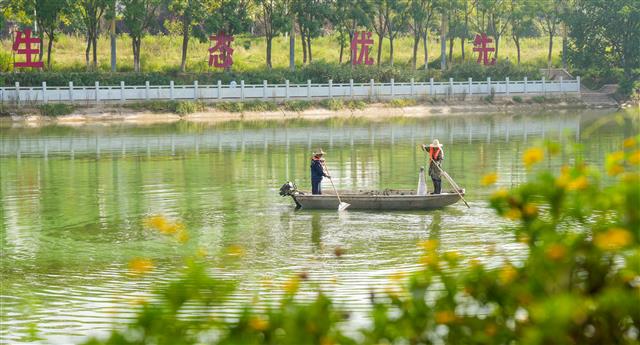 近日,在龙溪河长龙镇段,清漂船划过河面,留下一道道波纹,为平静的河面平添了一份涟漪,尽显自然生态之美。