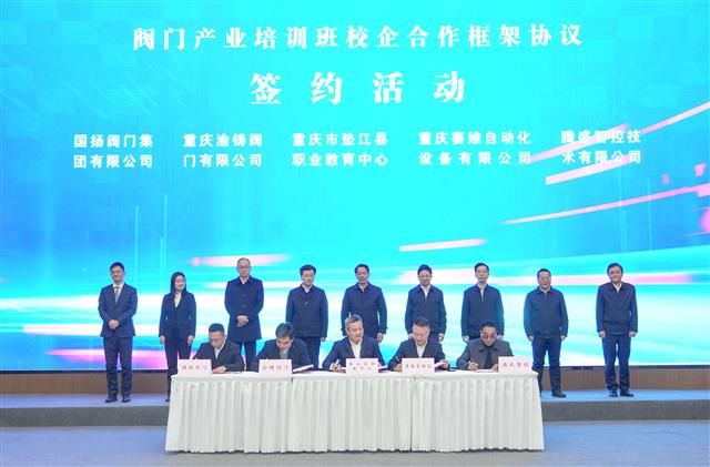 1月22日,重庆市垫江县职业教育中心与重庆渝铸阀门有限公司、腾盛智控技术(重庆)有限公司、国扬阀门集团有限公司、重庆赛维自动化设备有限公司等四家阀门企业正式签署《西部智能阀门产业培训班校企合作框架协议书》,联合共建“阀门产业培训班”,围绕实训基地建设、定向人才培养、师资双向交流等方面深化协作,为区域智能阀门产业转型升级注入高素质技能人才新动能。