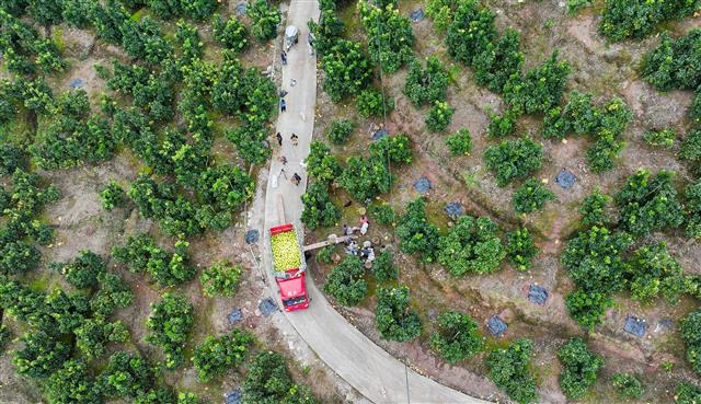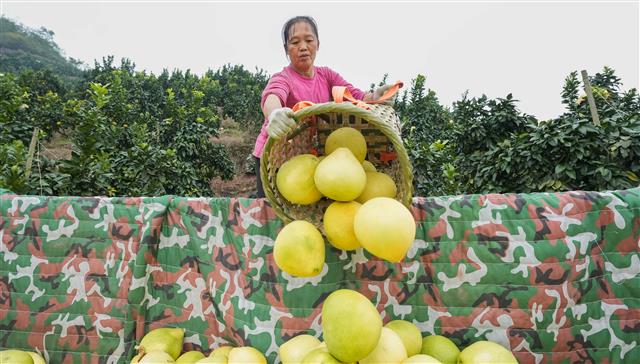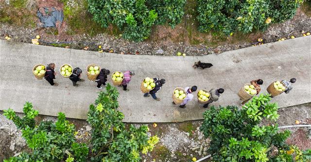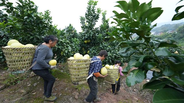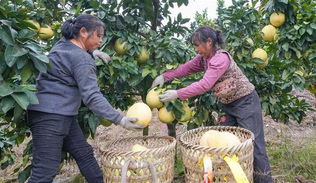 初冬时节,又到柚子采摘季。近日,坪山镇九龙社区太丰果树种植专业合作社蜜柚基地,工人忙碌着采摘柚子,柠黄的柚子装满一个个背篓,映照出产业振兴带动农民增收的喜人图景。