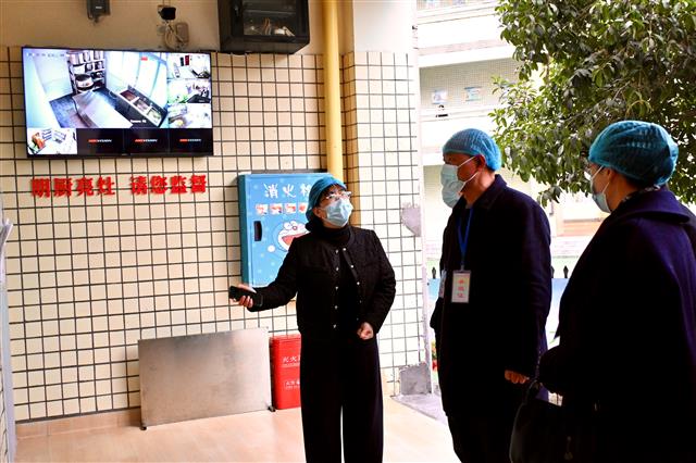 (检查桂阳中心幼儿园食堂。记者 何维 摄)