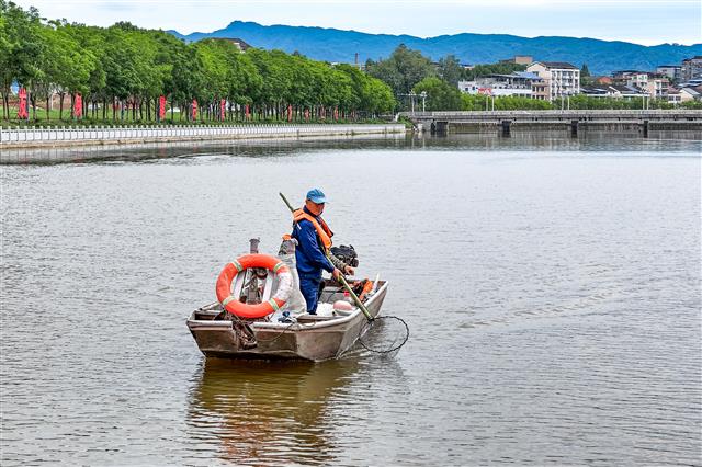 10月21日,龙溪河高安段河面上,清漂工人驾着小船,手持捞网认真打捞水面杂物,澄澈的河水漾起圈圈涟漪,一幅生态优美的水乡图景尽收眼底。