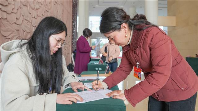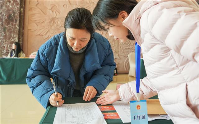 (报到现场工作人员引导人大代表签到。记者 龚长浩 摄)