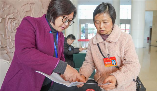 (人大代表了解会议议程。记者 龚长浩 摄)
