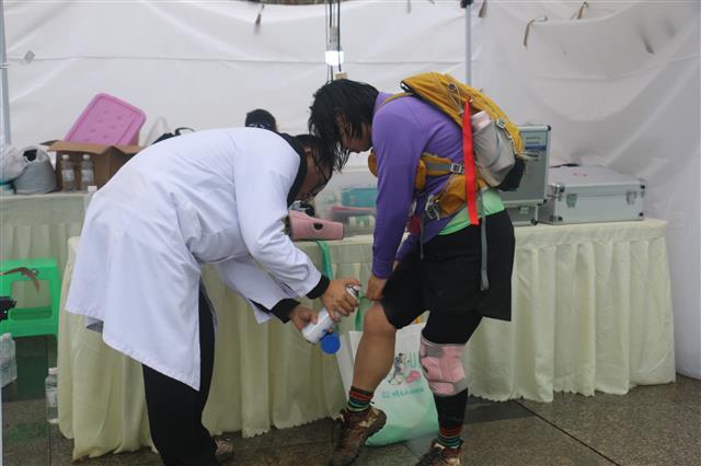 (医护人员为参赛选手处理伤口。记者 王喜 摄)
