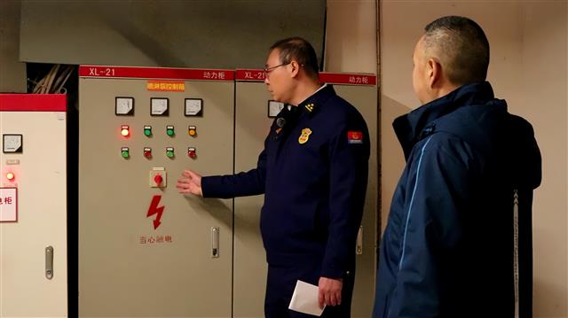 (检查人员查看喷淋泵控制箱。记者 陈泓宏 摄 )
