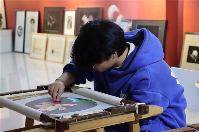 垫江刺绣的工艺也极致考究,染料取天然植物,需精准把控温度才能染出万种色系;绣前绷布务必平整,勾稿细至毫厘。同时,核心绣线由蚕丝制成,可劈至1/128粗细,最细仅5到8微米,不足发丝十分之一,搭配独特针法造就的“光影绣”,能让作品随视角流转尽显灵动。
