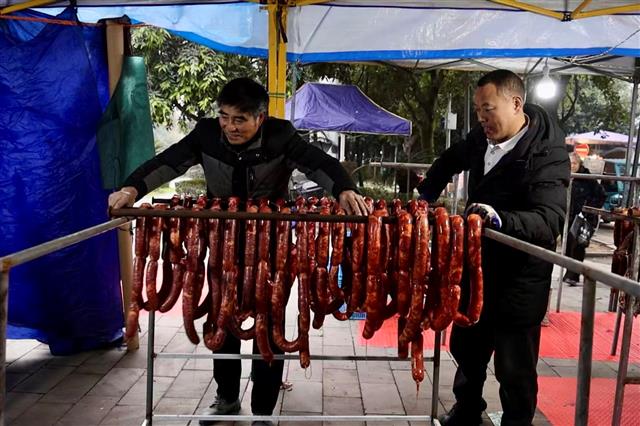 “年关越来越近,熏制腊肉、香肠的市民越来越多,高峰期预计一天能熏制腌腊制品一千斤左右。”桂阳街道税务八一大院治安岗亭对面集中熏制点经营户杨代洪介绍,集中熏制原料采用传统的柏树枝、木块等天然材料,可保证腊味纯正。
