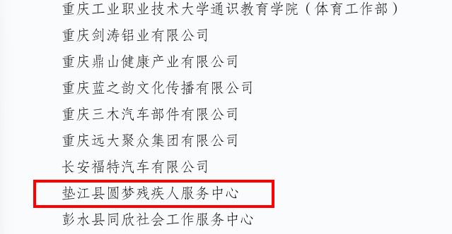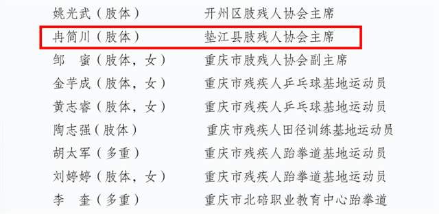 近日,重庆市自强模范暨助残先进集体和先进个人名单公布。经严格评选,垫江县肢残人协会主席冉简川荣获“自强模范”称号、垫江县圆梦残疾人服务中心荣获“助残先进集体”称号。