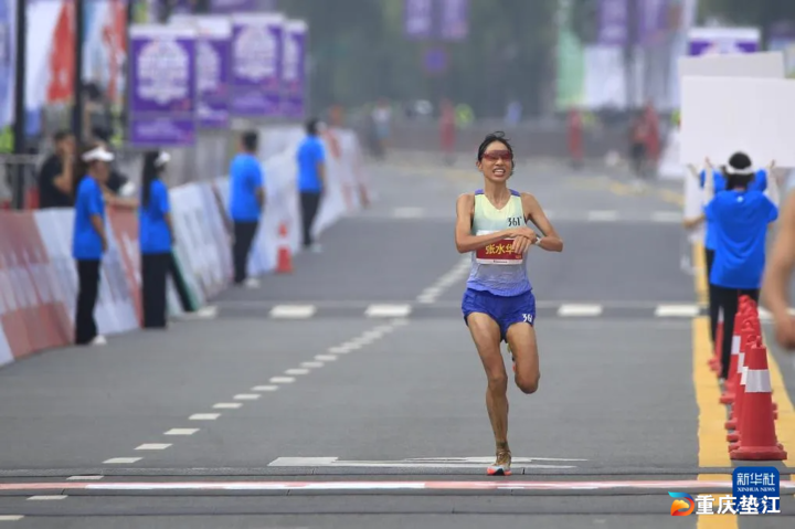 8月31日,参加马拉松女子组比赛的张水华到达终点。图源新华社