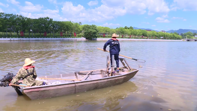 “这河面上的杂物就像地里的杂草,得天天盯。”清漂队员一边说着,一边将捞起的垃圾装入船上的收集袋。