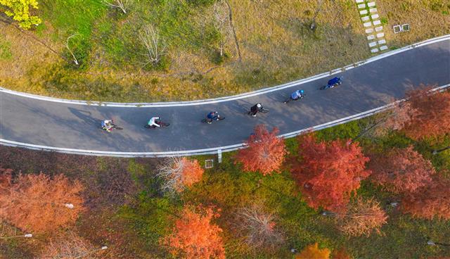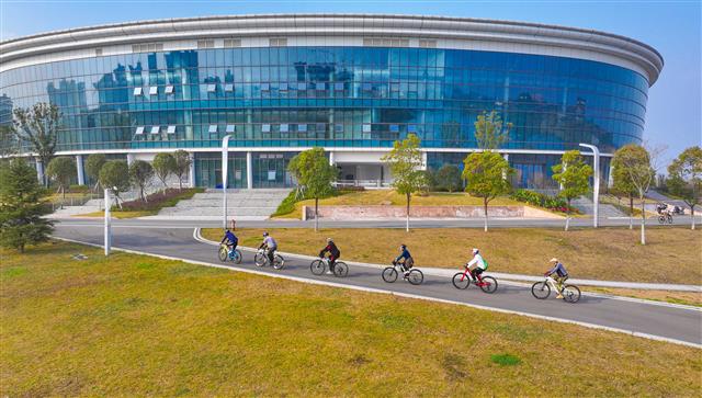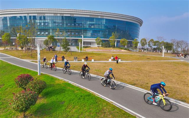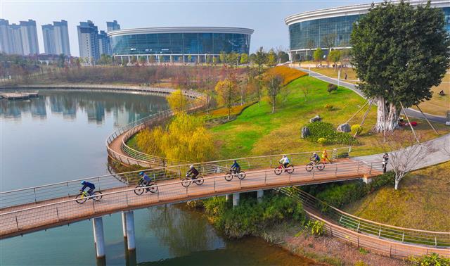 日前,三合湖湿地公园,冬日的公园美如画,市民在公园骑行和休闲,十分惬意。