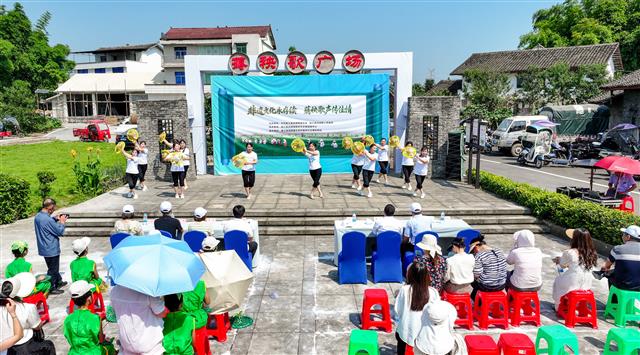 (高峰镇薅秧歌广场村民在开展活动。记者 龚长浩 摄)