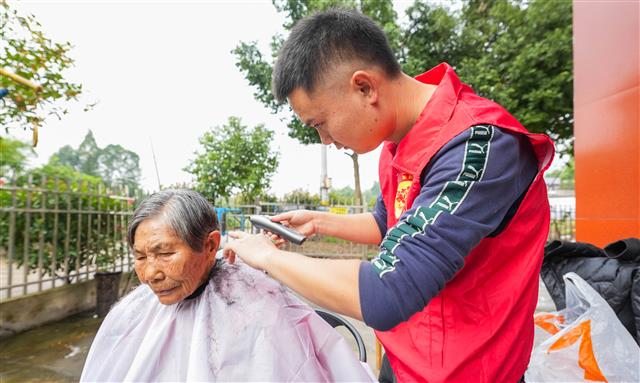(志愿者给老人免费理发。记者 龚长浩 摄)