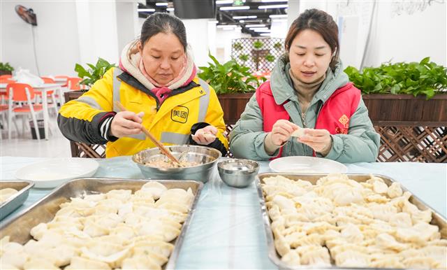(外卖配送员在天宝社区和社区工作人员一起包饺子。记者 龚长浩 摄)