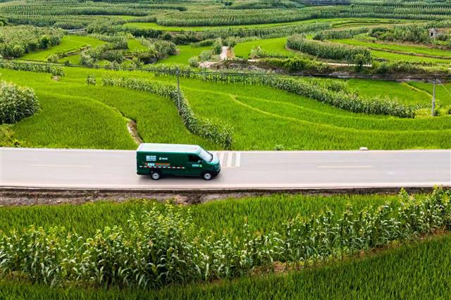 (快递车行驶在乡间小路上。记者 魏瑞 摄)