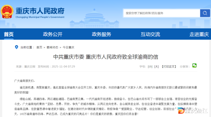 《中共重庆市委 重庆市人民政府致全球渝商的信》部分截图。