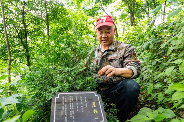 (志愿者查看野生崖柏长势。记者 魏瑞 摄)