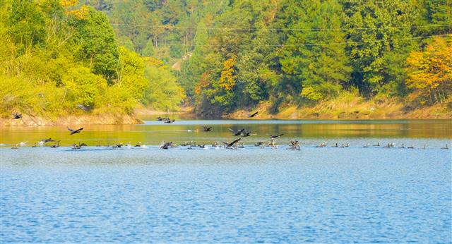 (成群的野鸭在迎风湖遨游。记者 龚长浩 摄)