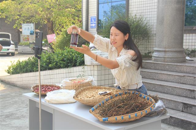 黄芪、黑花生、青花椒、苦瓜干……近日,砚台镇砚台社区助农直播间里,各类农特产品热销全网。(直播展示农产品。记者 王俊杰 摄)一张桌子、一副手机支架,一个简易的直播间就搭建完成了。砚台社区的社区干部就这样