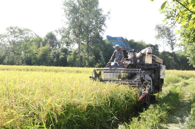 近日,普顺镇长柏村向家坝宁丰农机专业合作社水稻制种基地里,收割机来回作业收割水稻。(收割机正在收割水稻。记者 周迎迎 摄)“机械化收割大大提高了我们种粮的效益。”宁丰农机专业合作社负责人李少宁说,机械化