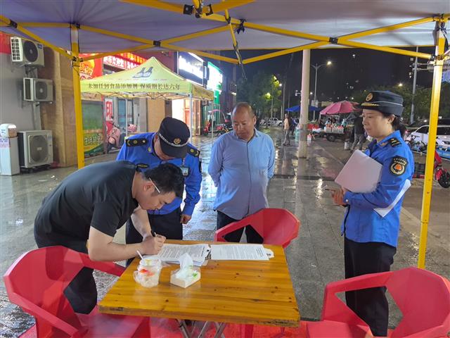 连日来,桂阳街道联合县生态环保局、县市场监管局、派出所等单位持续开展城区烧烤夜市、摊点行业专项治理,对群众投诉大的重点区域夜市烧烤严格落实三控三限三有措施,重拳出击,全力整治。商户正在签订承诺书。记者