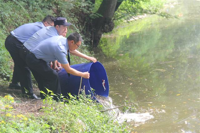 5月21日,县检察院、县农业农村委、县公安局在长江一级支流垫江县永安镇龙溪河三河口段开展水生态修复增殖放流,督促非法捕捞水产品涉案当事人投放900余公斤、3000余尾翘嘴鲌鱼。工作人员将鱼种放入龙溪河内。记者
