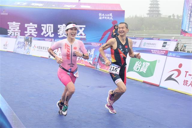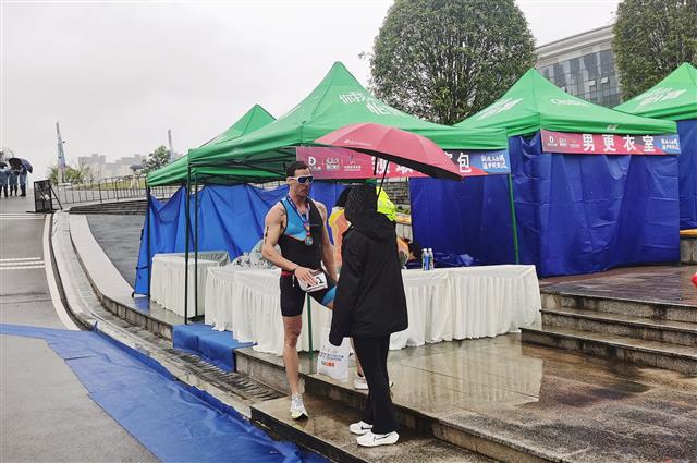 4月21日,2024重庆垫江铁人三项公开赛暨重庆市铁人三项队运动员选拔赛在三合湖湿地公园举行。高质量的赛事服务赢得选手们的一致点赞。选手在赛道上奔跑。记者 王俊杰 摄来自宜宾、男子半程30—39岁组冠军选手黎勇说