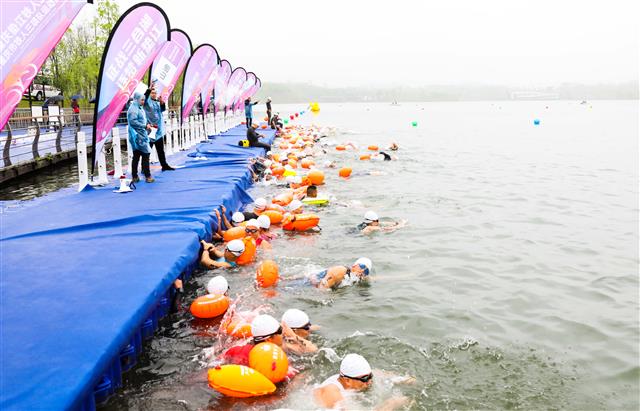 4月21日,2024重庆垫江铁人三项公开赛暨重庆市铁人三项队运动员选拔赛正式拉开帷幕。来自全国各地的603名“铁三”好手齐聚垫江三合湖湿地公园,展开一场速度与耐力的较量。比赛现场。记者 龚长浩 摄早上8时30分,在