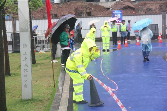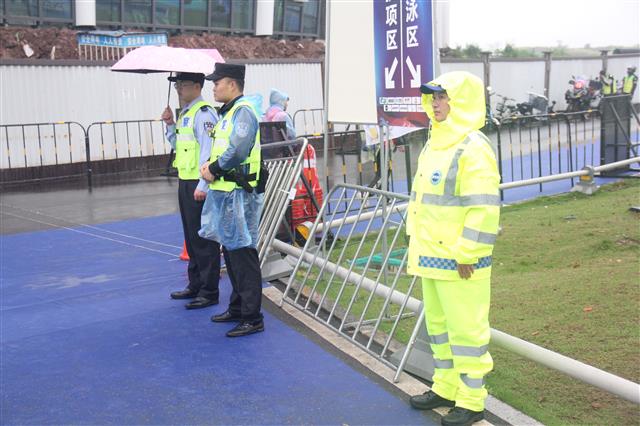 4月21日,2024重庆垫江铁人三项公开赛暨重庆市铁人三项队运动员选拔赛在三合湖湿地公园举行。300名安保人员恪尽职守、忠诚履职、热情服务,全力护航铁人三项赛。正在执勤的安保人员。记者 王俊杰 摄早上7点40分,记