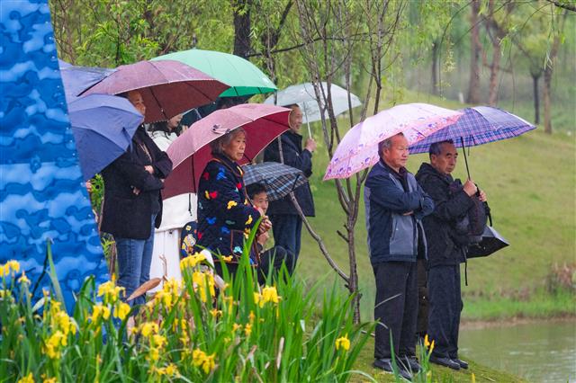 4月21日,2024重庆垫江铁人三项公开赛暨重庆市铁人三项队运动员选拔赛在三合湖湿地公园举行。吸引了众多市民前往观赛。市民在湖边观赛。记者 魏瑞 摄记者在比赛现场看到,市民们热情高涨,大家聚集在赛道两旁,认真