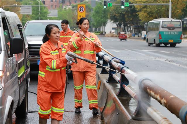 国瑞·2024重庆垫江马拉松赛将于3月31日开赛。为保障比赛顺利进行,县城市管理局对赛道沿线开展道路清洗和环境整治,营造干净、整洁的城市环境。环卫工人仔细清扫赛道。记者 张瀚月 摄在三合大道马拉松比赛路段,记者