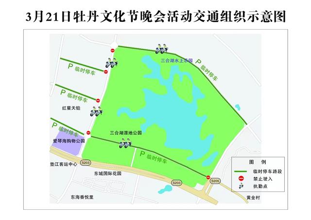 近日,记者从县公安局交巡警大队了解到,为保障牡丹文化节开幕式期间道路交通安全、畅通、有序,县交巡警大队将在三合湖周边道路分时段、路段实行交通管制。交通管制示意图。受访单位提供此次实施交通管制时段为:3
