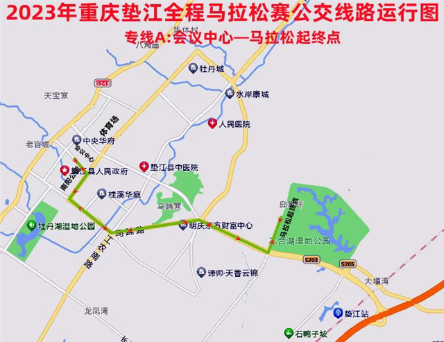 国瑞·2024重庆垫江马拉松赛开跑在即。近日,县交通局制定了赛事运输保障方案,保障运动员有序参赛。具体运输保障如下:马拉松专线A路线运行图示。3月30日,选手可凭参赛短信在高铁站乘车,接驳时间为8:30—19:30,
