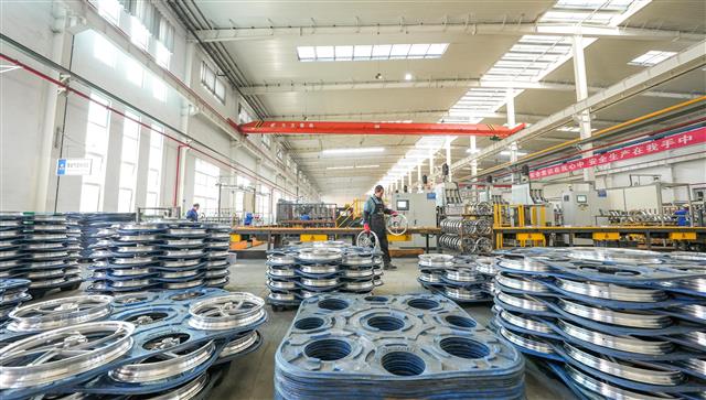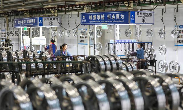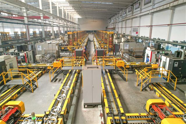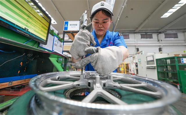 (工人正在赶工。)(工人正在作业。)(工人正在检查轮毂质量。)(忙碌的生产线。)(生产车间一角。)近日,重庆捷力轮毂制造有限公司生产车间内,工人正在赶制出口轮毂产品。目前,该公司摩托车、汽车轮毂迎来了