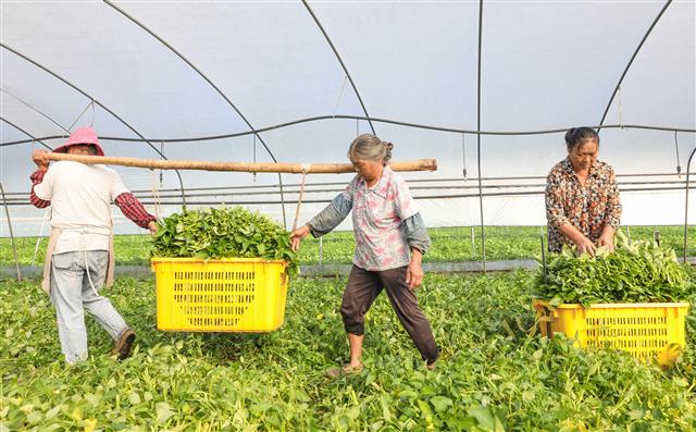 (基地一角。)(采收蔬菜。)(转运蔬菜。)2024年9月13日,高峰镇大井村蔬菜基地,工人在采收新鲜的空心菜,准备供应到重庆主城区。近年来,该村按照“一村一品”发展思路,依托龙溪河丰富的水资源优势,在沿河两