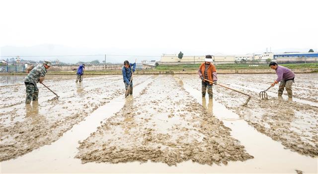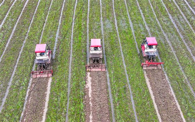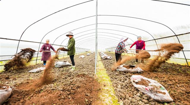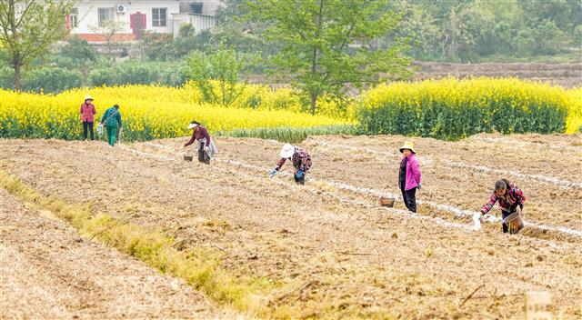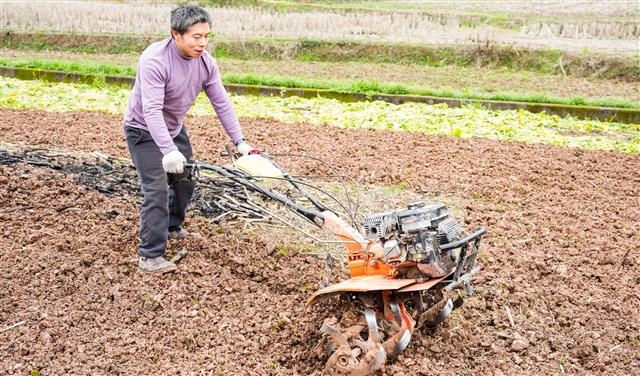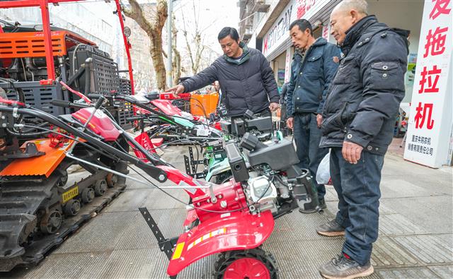2月26日,新民镇七桥村魔芋基地,工人在耕地。2月27日,三溪镇双龙村,村民在耕地。2月27日,三溪镇双龙村,该镇农技员(右一)指导黄金施肥。当下,我县正值春耕的时节,各地村民通过农技人员精准指导及时备耕,确