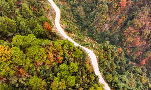 秋季的明月山,红的黄的绿的相互交融,彩林满目,宛如一个五彩斑斓的童话世界,游客驾驶着车辆穿梭其中,犹如进入了一幅浓墨重彩的油画。图为11月5日,明月山天香旅游公路桂阳街道至新民镇段。记者丨龚长浩 编辑丨余