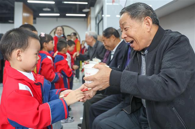(小朋友亲吻家长。)(小朋友表演手势舞。)(小朋友表演手势舞。)(小朋友送祝福语。)(小朋友为老人送长寿面。)2024年10月11日,县教委示范幼儿园松林分园开展“九九重阳节 老少集聚欢乐多”感恩活动。当日,