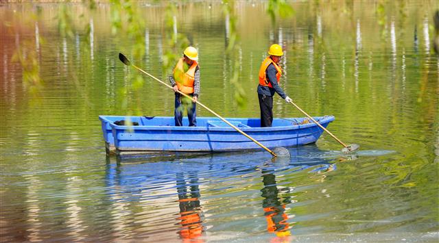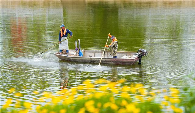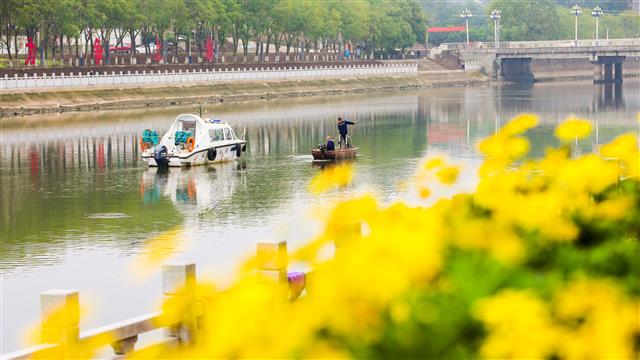 工人正在清漂。工人正在打捞杂物。10月21日,龙溪河高安段河面上,清漂工人驾着小船,手持捞网认真打捞水面杂物,澄澈的河水漾起圈圈涟漪,一幅生态优美的水乡图景尽收眼底。近年来,该镇严格落实河长制相关要求,建